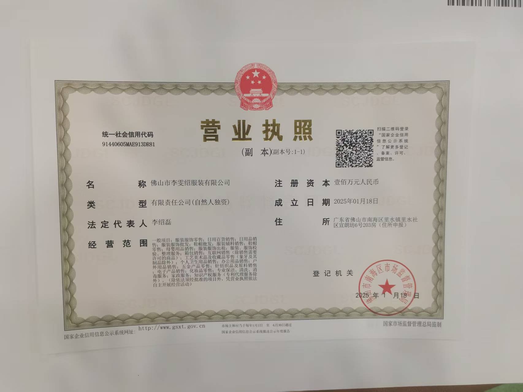 - 회사 주소: 广东省佛山市南海区里水镇里水社区宣朗坊6号203房(住所申报)